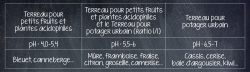 Saviez-vous que la plupart des variétés de petits fruits préfèrent un pH légèrement acide (entre 5,5 et 6). Tandis que d’autres, comme le bleuet, nécessitent un pH encore plus acide. Voici un petit tableau pour vous aider à repérer les besoins des variétés que vous choisirez.