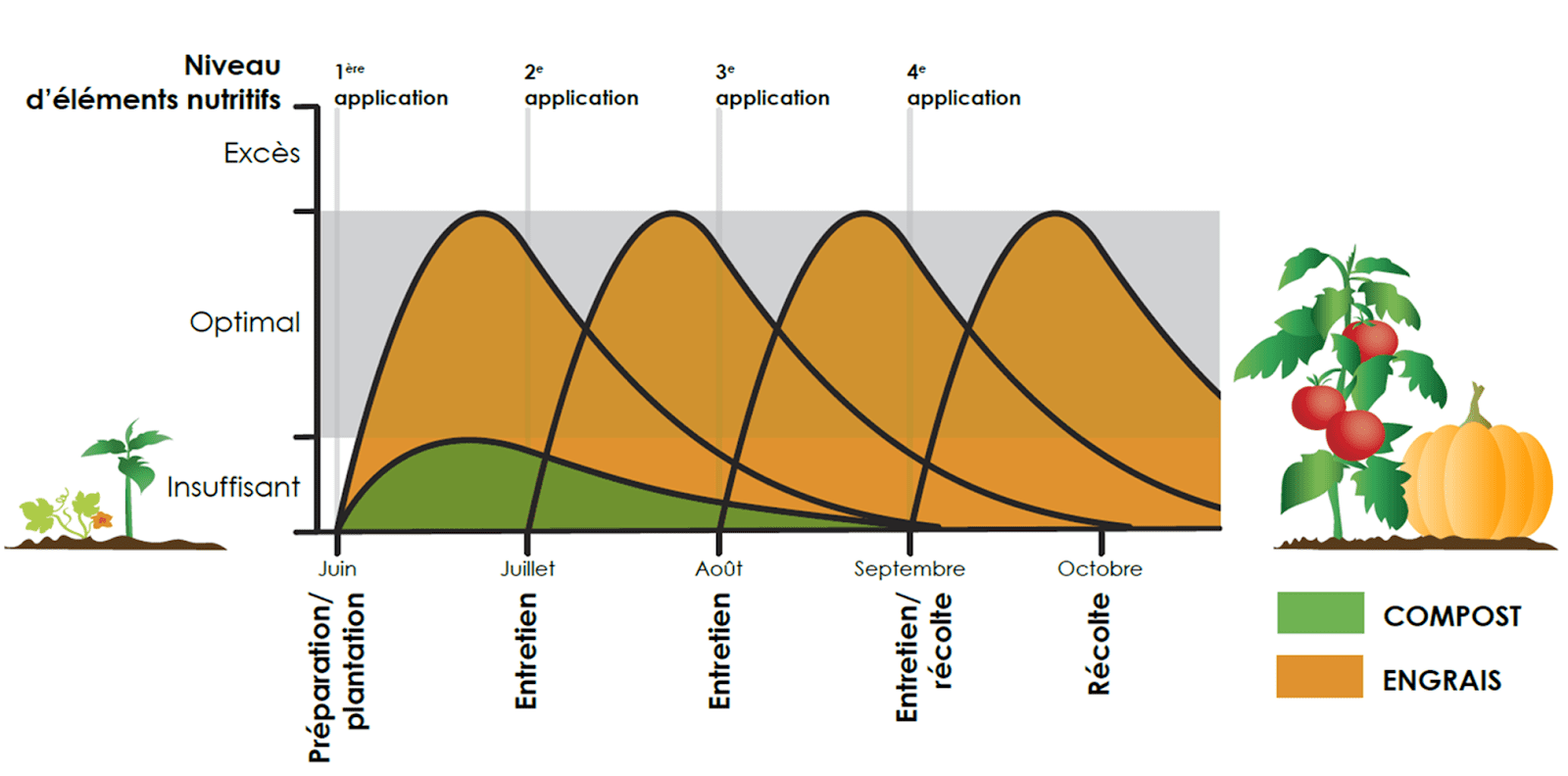 En résumé, votre jardin et vos plates-bandes ont besoin d’un apport équilibré en nutriments tout au long de l’année. Il est important de comprendre que compost et engrais sont complémentaires et qu’ils jouent chacun un rôle crucial dans la croissance de vos plantes. Les composts nourrissent le sol et en améliorent la qualité (structure, vie microbienne), tandis que les engrais nourrissent les plantes. À eux seuls, les composts ne suffisent pas, car leur apport s’épuise lentement au cours de la saison. C’est là que les engrais entrent en jeu, car ils contiennent une plus grande quantité de nutriments. Ils viendront compléter le travail du compost en soutenant la croissance saine et vigoureuse de vos plantes tout au long de la saison. (Voir graphique)