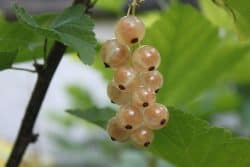 Currant bushes produce tiny red or white berries that are milder, sweeter and less acidic than gooseberries. They grow in bunches and their plants have no thorns. The fruit forms in mid-summer. Although the currant is self-fertilizing, cross-pollination is not necessary. Of course, you’ll get more fruit if you plant two!