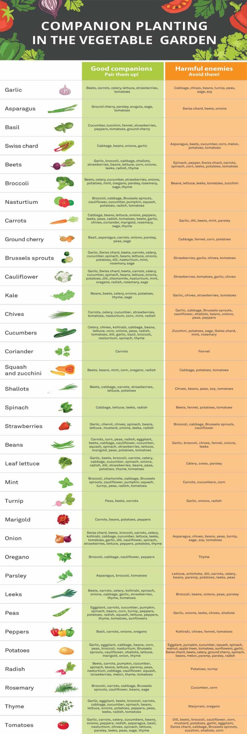 Here’s a companion growing chart for your vegetable garden. It lists the best combinations to make and those to avoid.